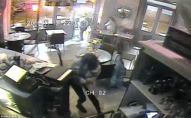 There is also remarkable footage of a 20 year old waitress who ducked under the bar and wrapped her arms around an older, injured woman as the Islamic State gunman sprayed the restaurant and its outdoor dining area with bullets. The gunman seen in the video is believed to be 26-year-old Belgian Salah Abdeslam (inset), who is still on the run. The Daily Mail can today reveal the horrifying footage with second-by-second commentary.