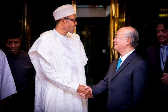 President Buhari on today received the Director-General of International Atomic Energy Agency (IAEA) Mr Y. Amano at the Statehouse. In the group photo taken after the meeting were the Minister of Health Isaac Adewole, Minister of Works, Power and Housing Babatunde Fashola, Vice President Yemi Osinbajo, Minister of Science and Technology Chris Ngige, and Minister of Solid Minerals Kayode Fayemi.